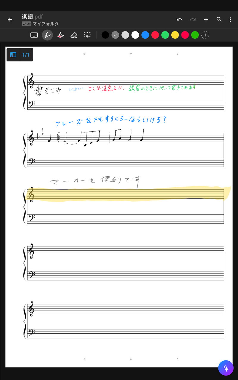 ・PDFの楽譜にレッスンで教わった内容や変更点を手書きで書き込みたい