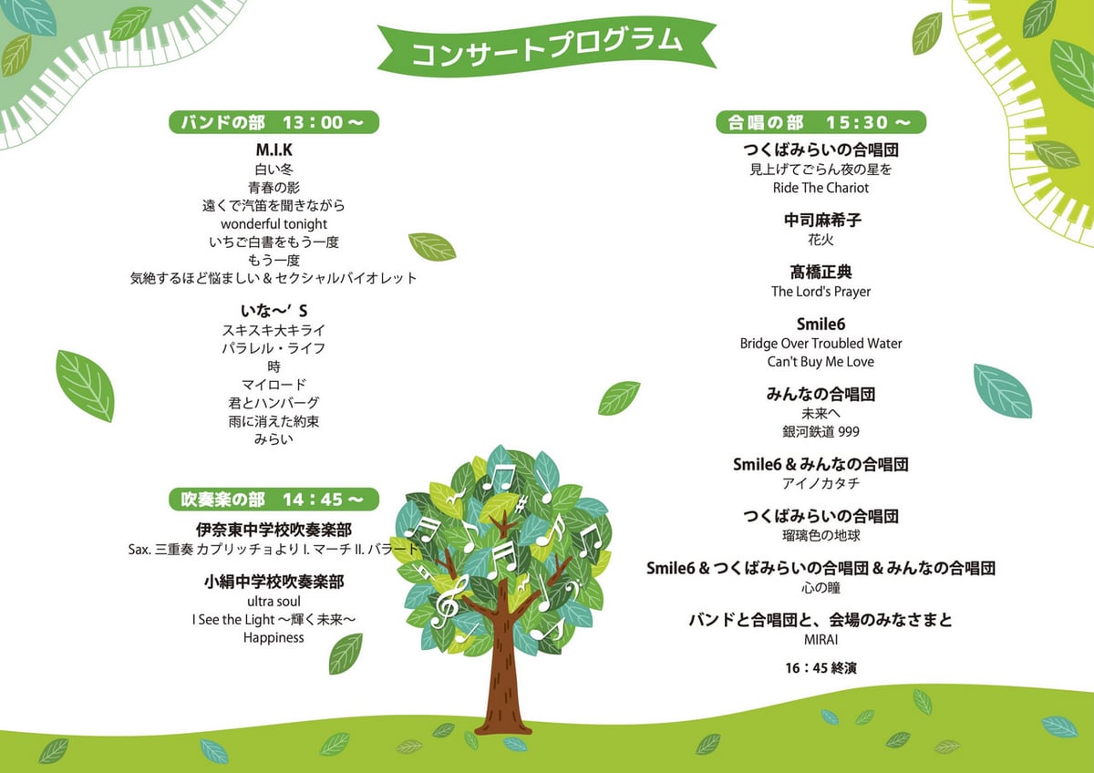 このコンサートでは去年できたばかりのつくばみらいの合唱団や20年以上前からここで活動しているバンド、中学校の吹奏楽部、その他関連する団体やプロの音楽家が参加し、みんなで音楽にメッセージを載せていきます。